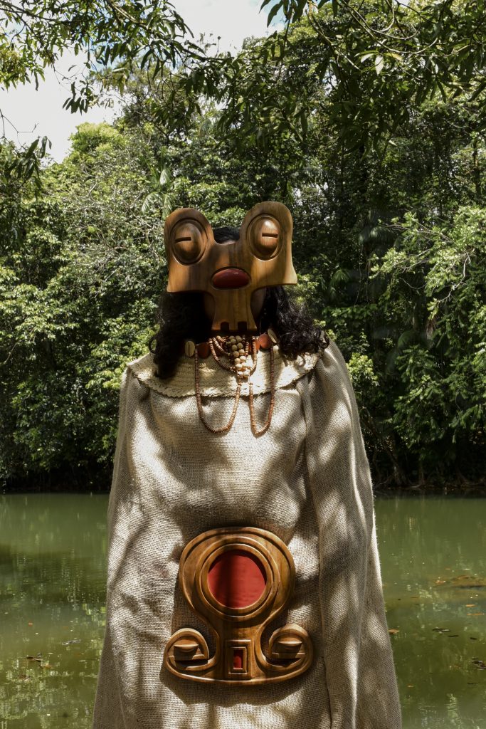 Nascida em Belém do Pará, Cristiane Martins investiga e recria formas, símbolos e imaginários das culturas arqueológicas amazônicas, articulando arte contemporânea e ancestralidade. Trabalha com escultura, máscaras e objetos corporais, utilizando madeira, urucum, folhas de ouro e fibras naturais. Suas obras ativam o corpo como território de memória, ritual e pertencimento, aproximando passado e presente por meio de uma poética simbólica e insurgente.